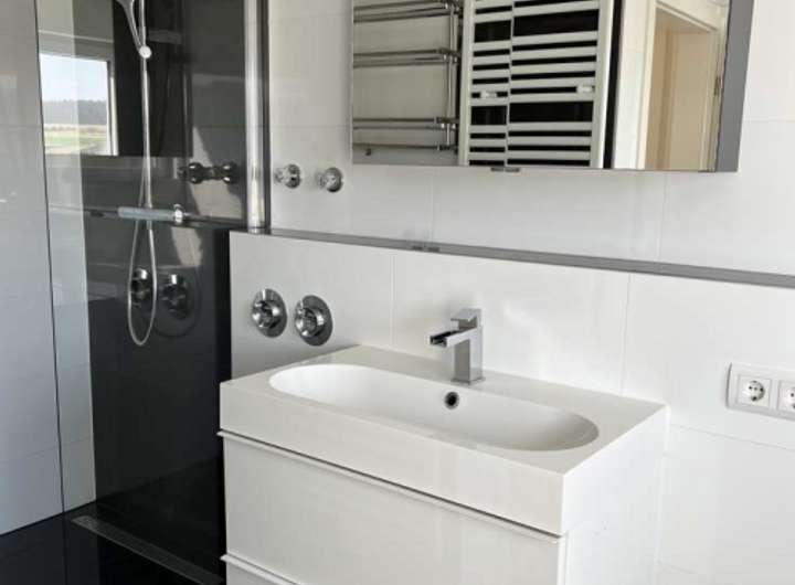 Das lichtdurchflutete Wohnzimmer mit Parkettboden und Zugang zum teilüberdachten Balkon schafft eine angenehme Wohnatmosphäre. Daran anschließt sich eine separate Nische mit ebenfalls direktem Balkonzugang. Die moderne Einbauküche ist mit hochwertigen Geräten ausgestattet und verfügt über einen separaten Vorratsraum. Das luxuriöse Tageslichtbad bietet eine Badewanne, eine bodengleiche Dusche, Fußbodenheizung sowie einen Handtuchwärmer, ergänzt durch ein separates WC.