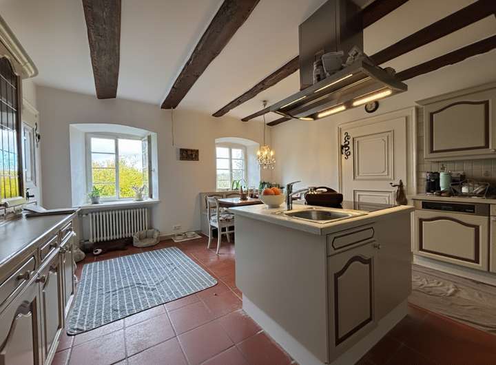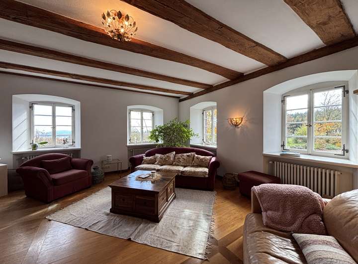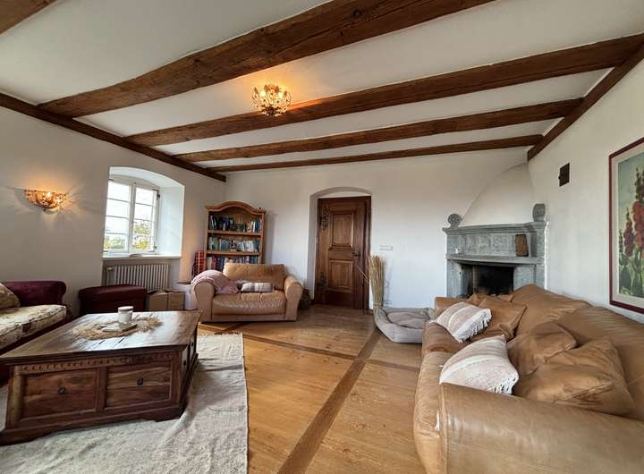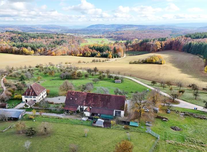 Das Hofgut Dornsberg liegt in ruhiger, exponierter Lage auf dem Höhenzug „Dornsberg“ bei Eigeltingen im Hegau. Von hier eröffnet sich ein eindrucksvoller Panoramablick über die sanft geschwungene Landschaft bis hin zum Bodensee. Das barocke Anwesen wurde um das Jahr 1750 ursprünglich von den Mönchen des berühmten Kloster Salem erbaut, die gleichen Bauherren des Barockjuwels Birnau. Heute präsentiert sich das Hofgut als außergewöhnliches Ensemble aus Geschichte, Natur und landschaftlicher Schönheit – ein Ort mit Charakter, Ruhe und großem Potenzial. Die Lage bietet absolute Privatsphäre und zugleich eine gute Erreichbarkeit. Durch die erhöhte Position auf dem Dornsberg genießen Bewohner und Gäste einen unverbaubaren Weitblick in alle Himmelsrichtungen. Das historische Haupthaus zeigt sich als klassisches Herrenhaus mit liebevoll erhaltenen, stilprägenden Details. Hohe Räume, große Fenster und massive Natursteinmauern verleihen dem Gebäude einen unverwechselbaren Charme. Die Innenräume wurden modernisiert, ohne den historischen Charakter zu verlieren. Im Eingangsbereich verströmen schöne Holztüren, Steinfliesen und die Holztreppe zum Obergeschoss edlen Landhausflair. Im Erdgeschoss befinden sich das Wohnzimmer mit offenem Kamin, die große Wohnküche mit angegliedertem Speisezimmer sowie Gäste-WC und Garderobe. Das Obergeschoss beherbergt zwei weitere Zimmer, das Familienbad sowie das Gästezimmer mit eigenem Bad. Der teilausgebaute Dachboden und die Kellerräume bieten gleichermaßen viel Stauraum. Die Gesamtanlage umfasst zudem diverse Nebengebäude, wie eine Scheune, ein ehemaliges Backhaus, eine alte Umspannstation und einen Schuppen. Sie eignen sich ideal für Tierhaltung, Werkstätten, Gästeunterkünfte oder Veranstaltungsräume. In der Scheune wurden für Pferdeliebhaber bereits zwei Pferdeboxen errichtet und Raum für weitere Boxen ist vorhanden. Für eine optimale landwirtschaftliche Nutzung kann weiteres Weideland dazu gepachtet werden. Das Hofgut Dornsberg bietet ein außergewöhnlich breites Nutzungsspektrum: