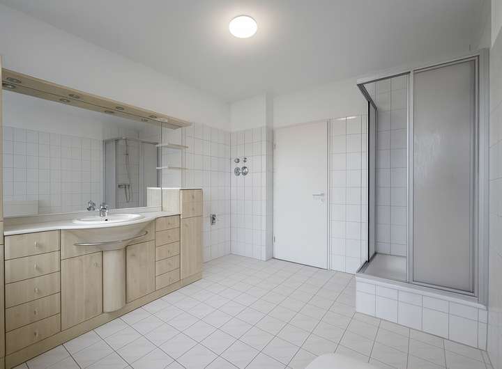 + Modern gefliestes Bad mit Dusche
