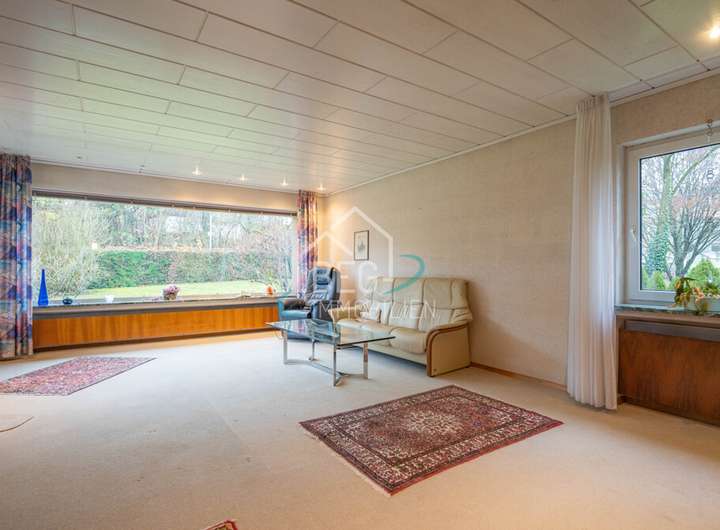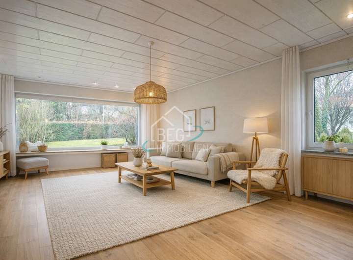 - Lichtdurchflutetes Wohnzimmer mit großen Fensterfronten