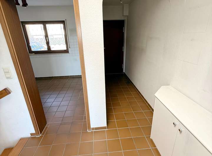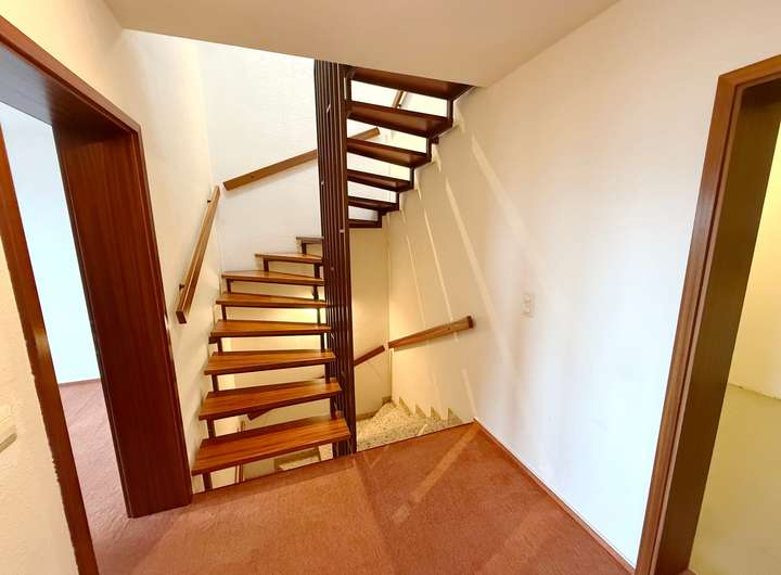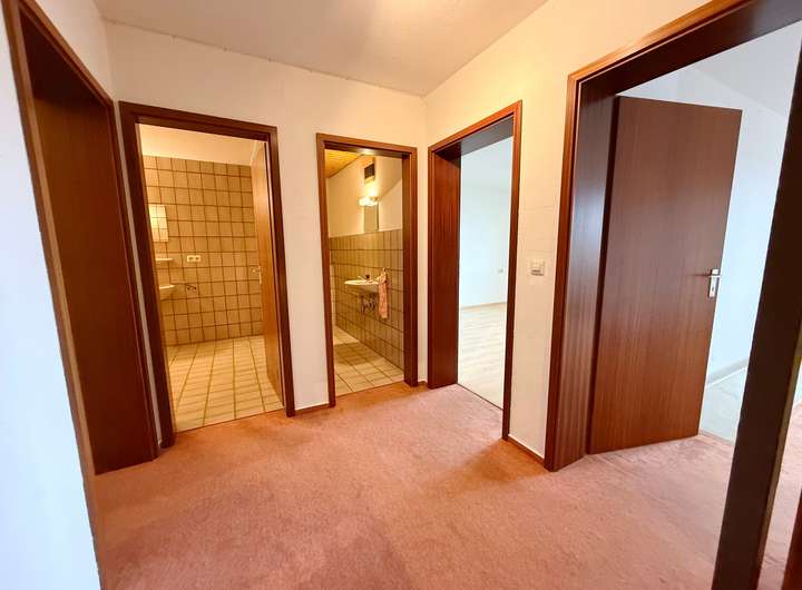 Die Küche ist geräumig und bietet viel Platz für Ihre neue Traumküche. Der Flurbereich ist durch das praktische Oberlicht sehr hell. Das Treppenhaus führt in die beiden darunterliegenden Geschosse. Im Mittelgeschoss befinden sich 2 Schlafzimmer mit gemeinsamen Balkon, sowie das große Bad mit Wanne, Dusche, WC und 2 Waschbecken. Ein weiteres WC liegt direkt daneben. Das Kinderzimmer und der Flur sind mit Teppichboden, das Schlafzimmer mit Laminatfußboden ausgestattet. Die Bäder sind gefliest. Im Mittelgeschoss bietet ein praktischer Abstellraum viel Staufläche.