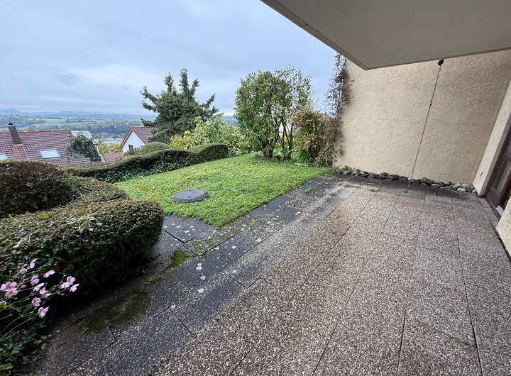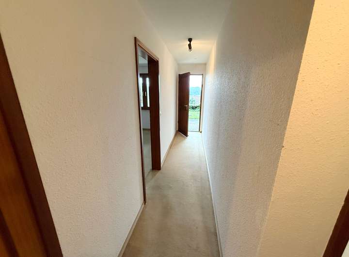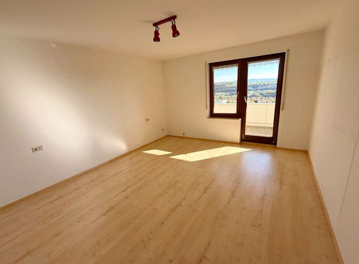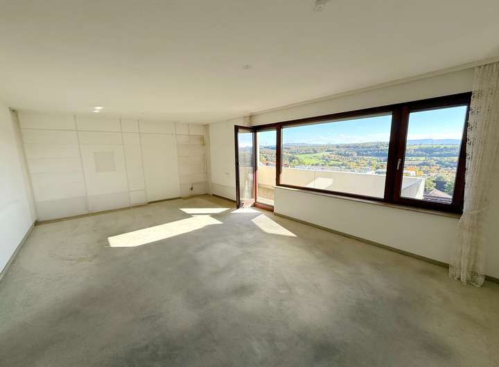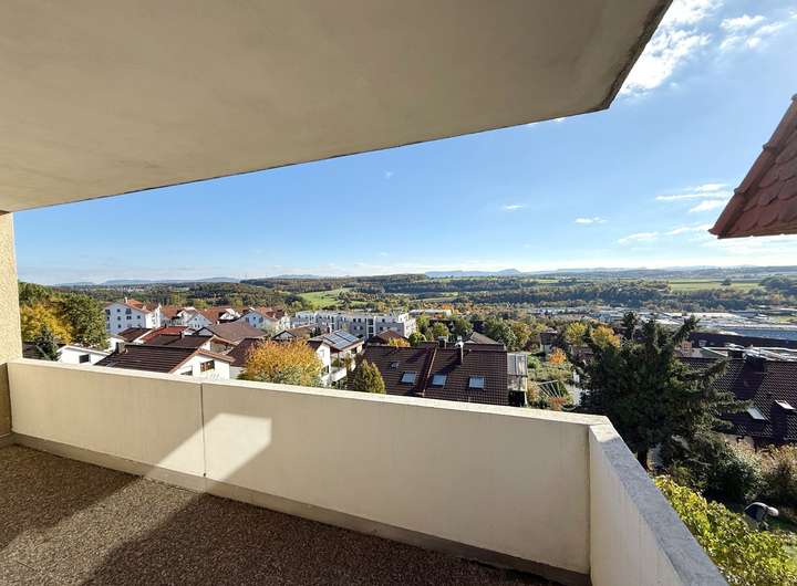 Sie betreten das Haus im Erdgeschoss. Ein Eingangsflur führt Sie an der Küche vorbei in Richtung des großzügigen Wohnbereichs. Er erstreckt sich über die gesamte Hausbreite und verfügt über eine große Fensterfront die nicht nur für viel Licht sondern auch einen atemberaubenden Blick über die Landschaft bis zur schwäbischen Alb bietet. Der sonnige Balkon lädt dazu ein, sonnige Stunden mit Ausblick zu genießen.