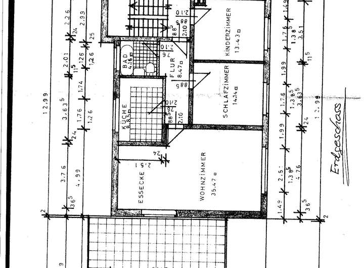Das Erdgeschoss (3 Zimmer, Küche, Bad, 84,5 m2 plus Terrasse) umfasst ein großzügiges Wohnzimmer mit Zugang zu einer ca. 36 m2 großen West-Terrasse sowie zwei weiteren Zimmern, eine Küche und ein Badezimmer.