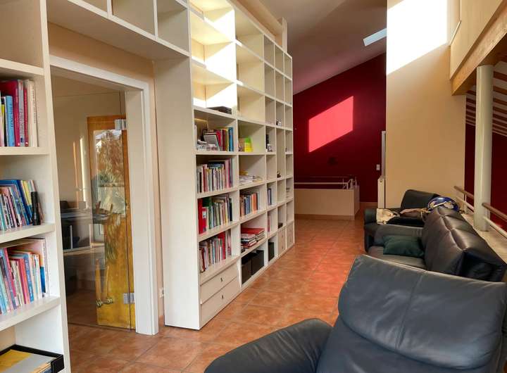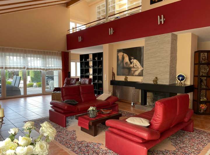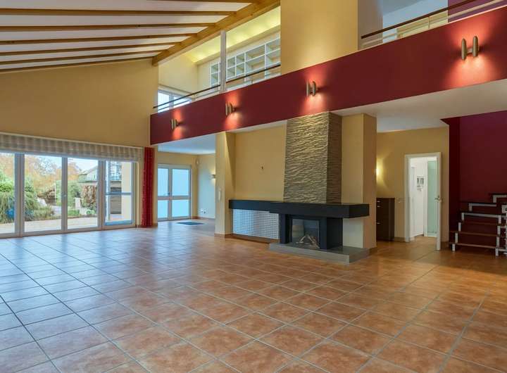 + Galerie-Wohnzimmer mit 4,80 m Deckenhöhe und offenem Kamin