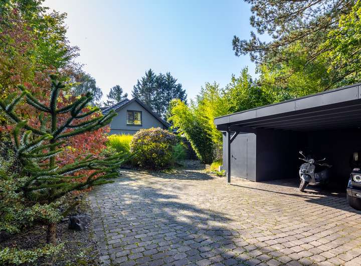 _ vor dem Haus befindet sich ein hochwertiges und erst in 2023 erstelltes Doppelcarport mit einem praktischen angrenzenden Schuppen, in welchem sich genügend Abstellfläche für Fahrräder etc. findet
