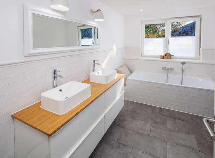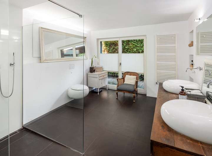 _ ein hell gefliestes Bad mit einer Badewanne und Dusche sowie ein weiteres Duschbad runden die oberen Räumlichkeiten ab