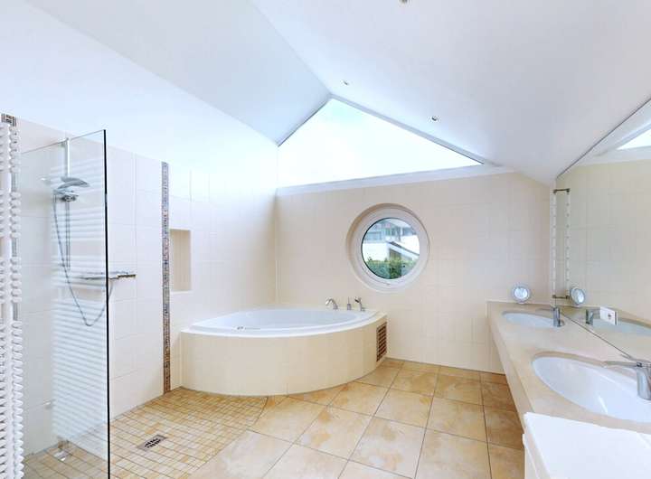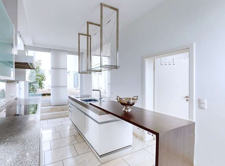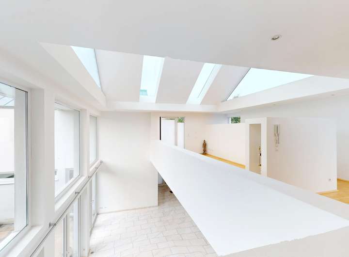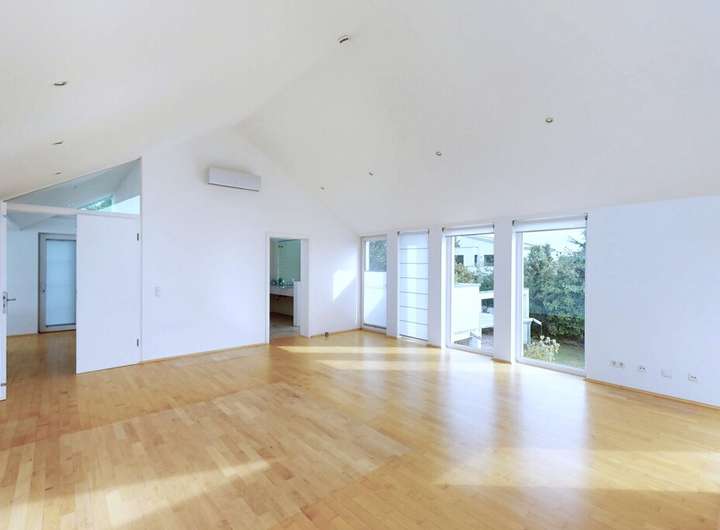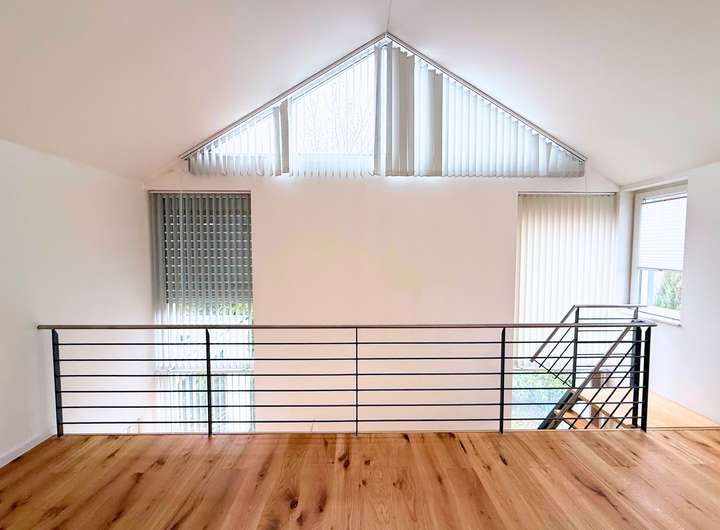 Die hochwertige Bulthaup-Küche mit Miele-Einbaugeräten, die direkt an den Wohn-Essbereich angrenzt, begeistert mit erstklassiger Ausstattung und zeitlosem, puristischem Design. Hier wird Kochen zum Erlebnis! Ein separater Wirtschaftsraum sorgt für zusätzlichen Komfort und Funktionalität. Das luftige Konzept setzt sich im Obergeschoss fort: Eine großzügige Galerie mit Blick in den Wohnbereich unterstreicht die moderne Architektur und schafft eine beeindruckende Raumwirkung. Der Hauptschlafbereich mit Bad en suite ist eine exklusive Rückzugsoase, die höchsten Wohnkomfort bietet – inklusive direktem Zugang zu einer privaten Sonnenterrasse mit Blick ins Grüne. Im Erdgeschoss ergänzen zwei weitere Zimmer mit eigenen Galerien und angrenzenden Duschbädern das Raumangebot. Ob als stilvolles Gästezimmer, Home-Office oder kreative Rückzugsorte – hier bleiben keine Wünsche offen.