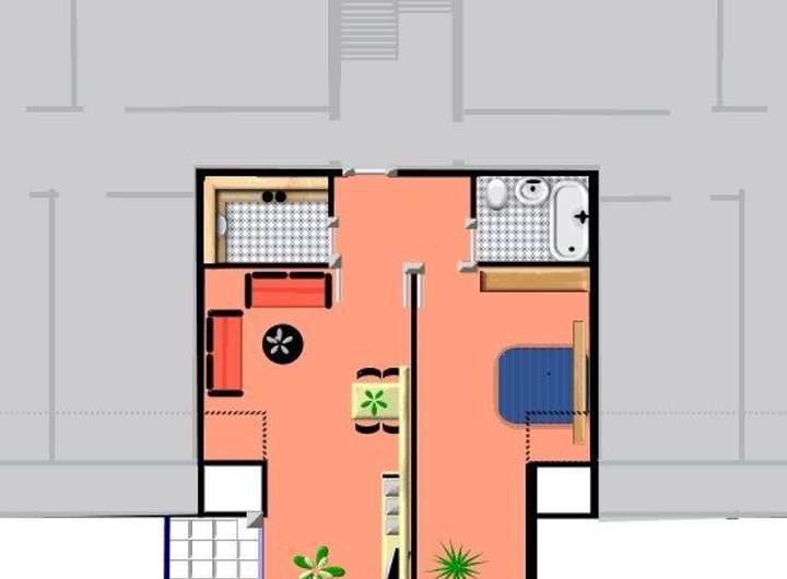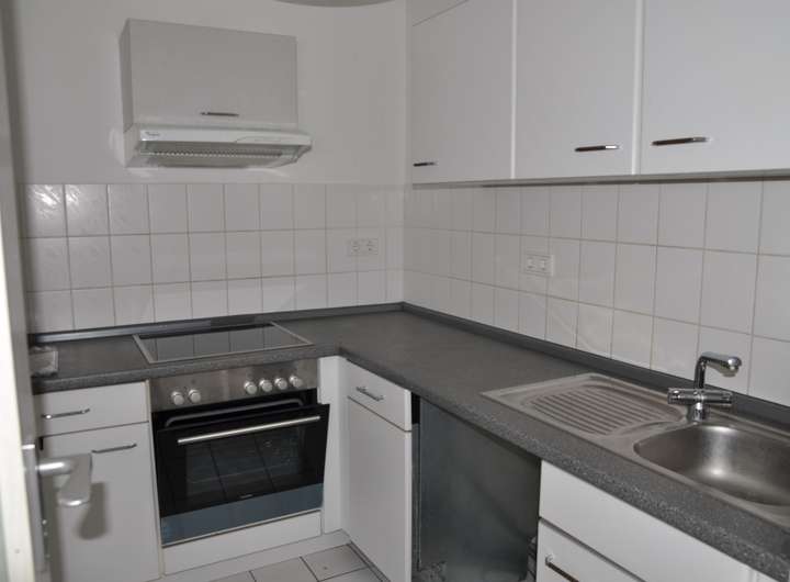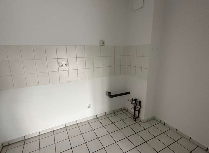 Die Küche befindet sich neben dem Wohnzimmer und hat kein Fenster. Es besteht jedoch die Möglichkeit, eine Durchbruch zum Wohnzimmer vorzunehmen und beim Einbau einer neuen Küche eine Art amerikanische Küche einzubauen.