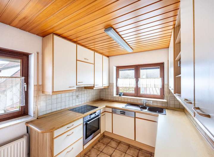 Die angrenzende Einbauküche ist funktional gestaltet und bietet ausreichend Platz für gemeinsames Kochen und gesellige Stunden. Auf dieser Ebene befinden sich außerdem ein Schlafzimmer sowie ein weiteres Zimmer, das sich flexibel als Kinderzimmer, Gästezimmer oder Homeoffice nutzen lässt und ein Tageslichtbad. Damit bietet das Erdgeschoss bereits vielseitige Wohnmöglichkeiten – auch ideal für Paare oder Familien, die Wert auf Wohnen auf einer Ebene legen.