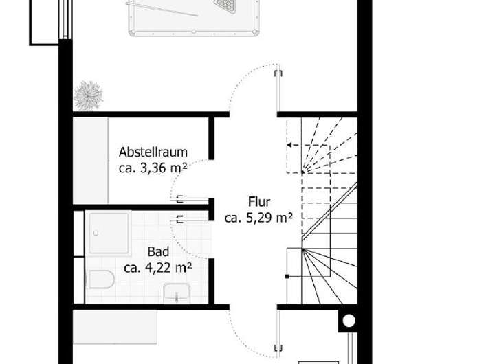 Hobbyraum in Wohnraumqualität, Duschbad, Abstellraum, Waschküche und Flur