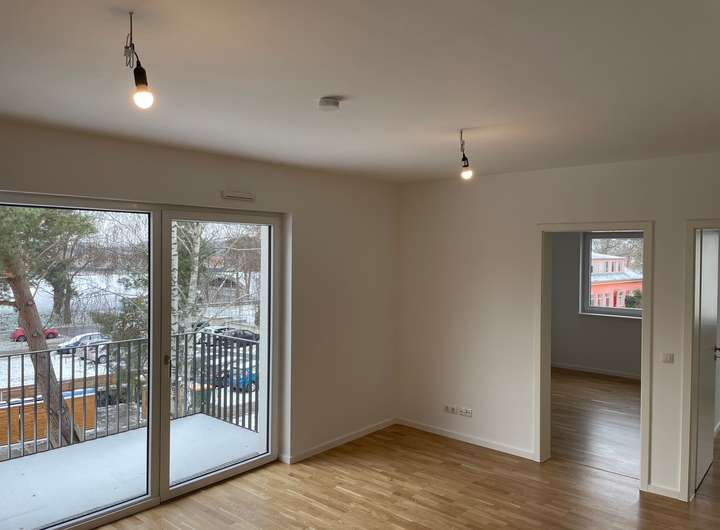 Der helle Wohnbereich bietet Zugang zum Balkon. Ergänzt wird die Wohnung durch zwei weitere Zimmer, ein Badezimmer sowie einen Abstellraum.