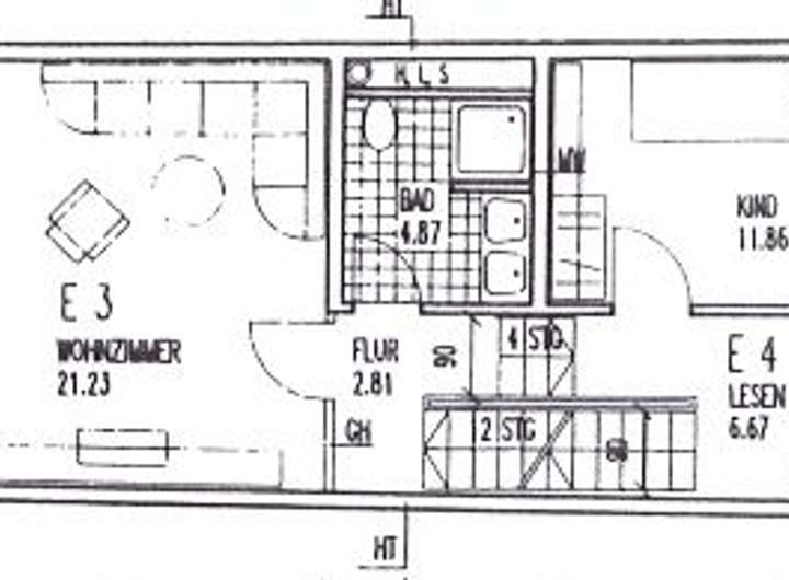 Auf der 3. und 4. Wohnebene findet man das Wohnzimmer mit Balkon, Kinderzimmer und ein Duschbad.
