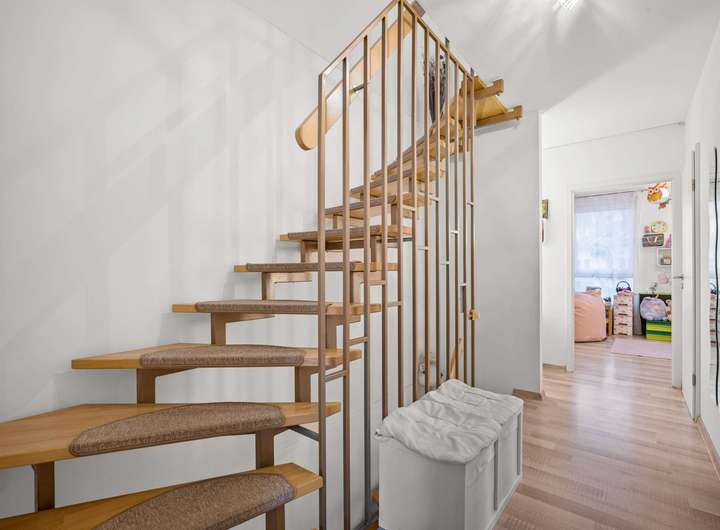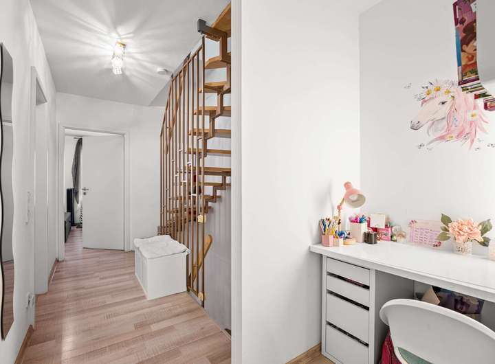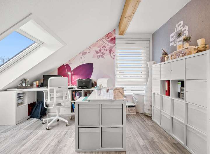 Auf rund 145 m² Wohnfläche verteilen sich fünf helle und großzügig geschnittene Zimmer, darunter vier Schlafzimmer, die vielseitige Nutzungsmöglichkeiten für Familien, Homeoffice oder Gäste bieten. Der neuwertige Gesamtzustand und die lichtdurchflutete Bauweise schaffen ein modernes, einladendes Wohnambiente. Ergänzt wird das Raumangebot durch ein Wannen- und Duschbad, ein separates Tageslicht-Duschbad sowie ein Gäste-WC. Eine Abstellkammer und ein praktischer Spitzboden sorgen für zusätzlichen Stauraum.