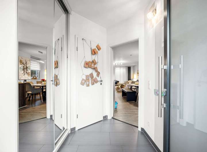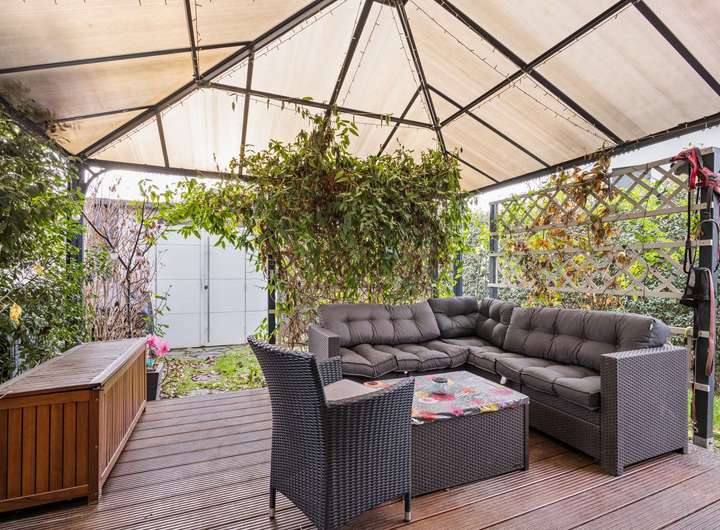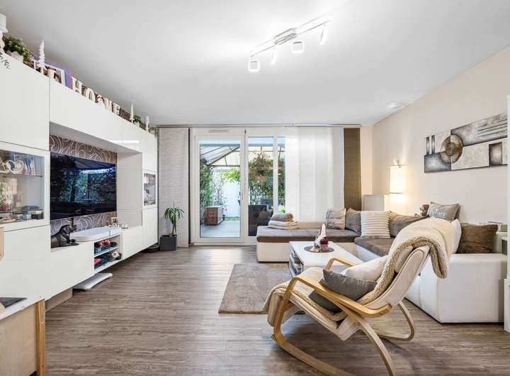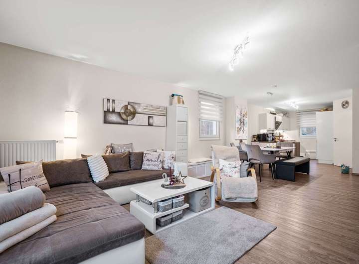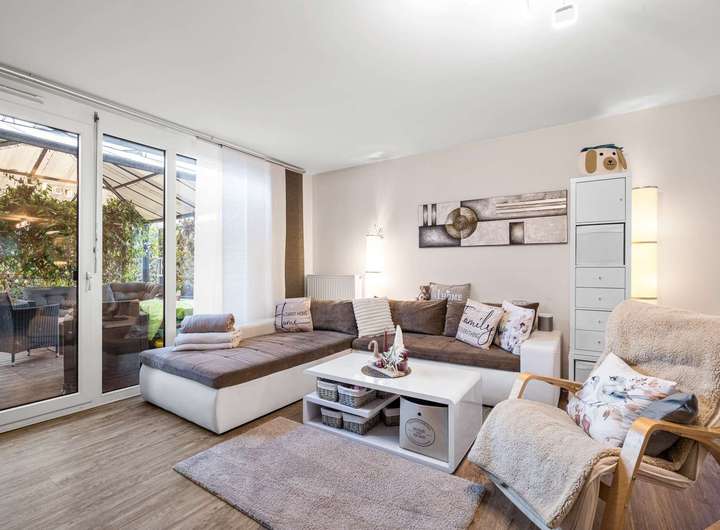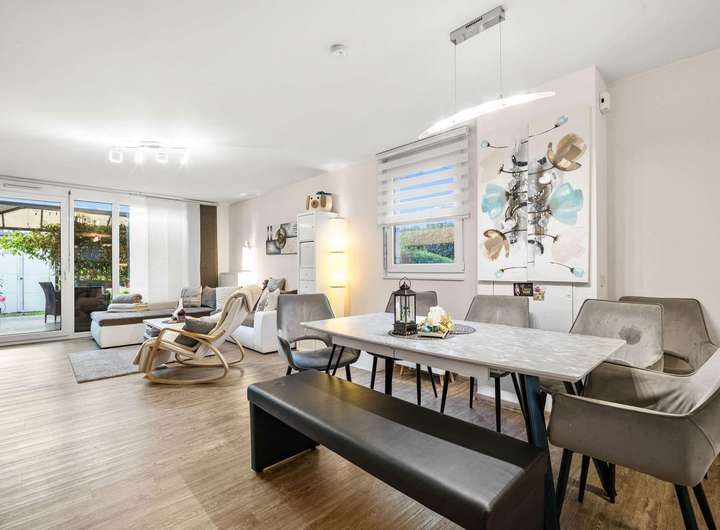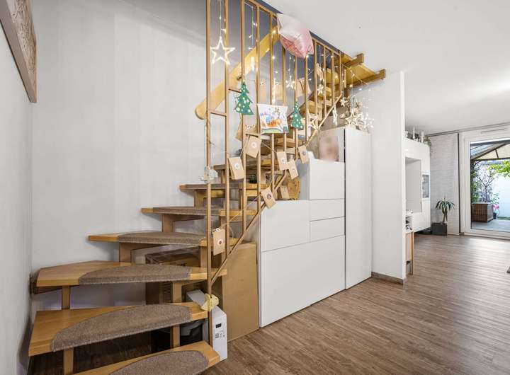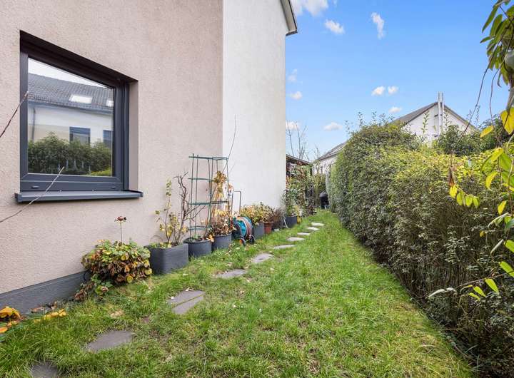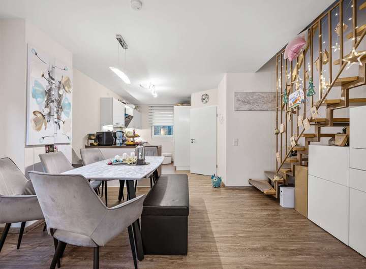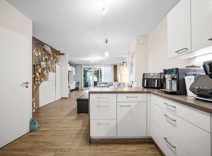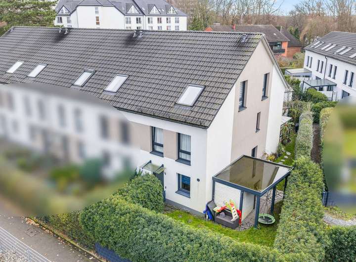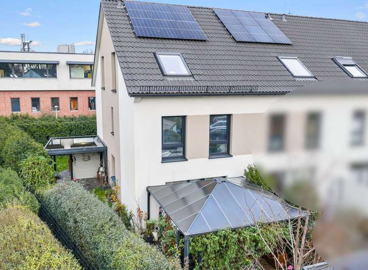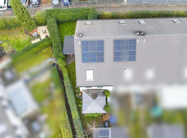 Die hochwertige Einbauküche, eine effiziente Nahwärmeversorgung, Smart-Home-Technik sowie eine 3,2 kWP Photovoltaikanlage unterstreichen den zeitgemäßen und nachhaltigen Charakter der Immobilie. Der Sondernutzungsbereich mit Terrasse und fest installiertem Pavillon lädt zum Entspannen im Freien ein. Ein privater Stellplatz rundet dieses attraktive Angebot ab.