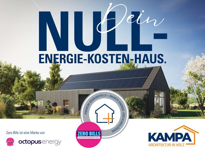 Dank PV-Anlage und Batteriespeicher erfüllen KAMPA Häuser die Voraussetzungen für den Zero Bills Tarif von Octopus Energie – und werden zu echten Null-Energie-Kosten-Häusern.