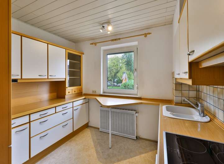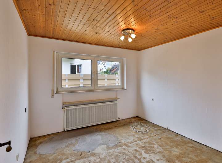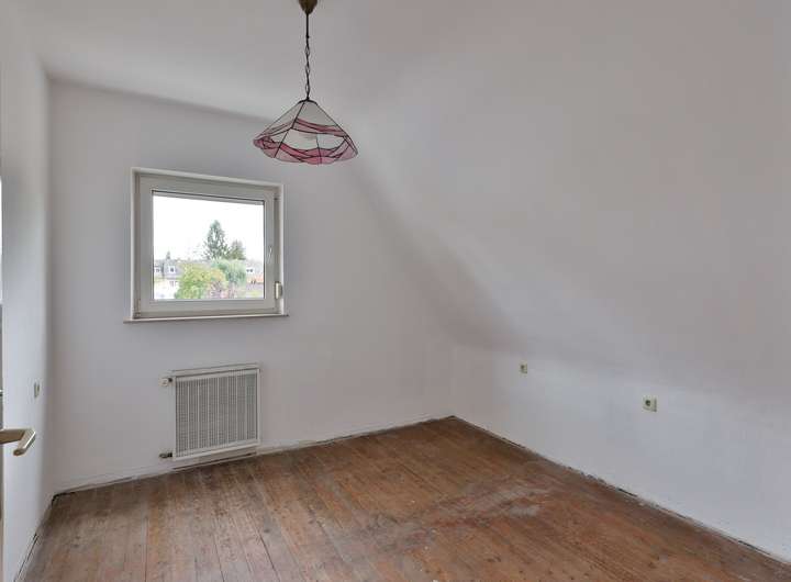 Im Erdgeschoss befinden sich eine kleine Küche, das großzügige Wohn- und Esszimmer, anschließend ein Schlaf- oder Arbeitszimmer, ein Duschbad mit Fenster sowie ein weiteres Kinder- oder Arbeitszimmer.