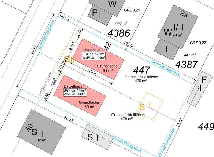 Neben dem Einzelverkauf dieser Teilfläche besteht auch die Möglichkeit, das gesamte Grundstück zu erwerben. Dadurch ergibt sich für Familien, befreundete Bauherren oder Mehrgenerationenkonzepte die Chance, zwei hochwertige Neubauten in direkter Nachbarschaft zu realisieren. Die großzügige Grundstücksgröße und die mögliche Aufteilung schaffen ideale Voraussetzungen für ein harmonisches Wohnensemble mit klar getrennten Einheiten.