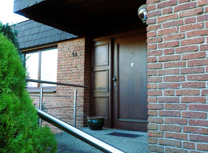 Beim Betreten des Hauses gelangen Sie zunächst in den Windfang mit anschließendem Gäste-WC. Von hier aus öffnet sich das freundliche Esszimmer, dass dank großer Fenster viel Licht bietet und direkten Zugang zu einem Balkon hat. Eine Treppe könnte hier problemlos ergänzt werden, um einen komfortablen Zugang zum Garten auch von dieser Etage aus zu ermöglichen - aktuell führt der Weg in den Garten über den Kellerausgang.