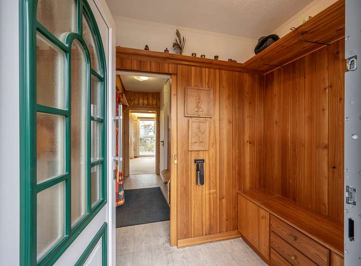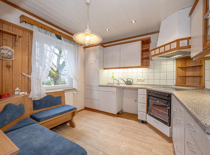 Die vorhandene Einbauküche bietet eine solide Basis für gemütliche Kocherlebnisse. Um modernen Ansprüchen gerecht zu werden können sicherlich diverse Teile ausgetauscht werden. Der Raum bietet sehr gute Gestaltungsmöglichkeiten für eine Eckbank und Platz für mehrere Personen.