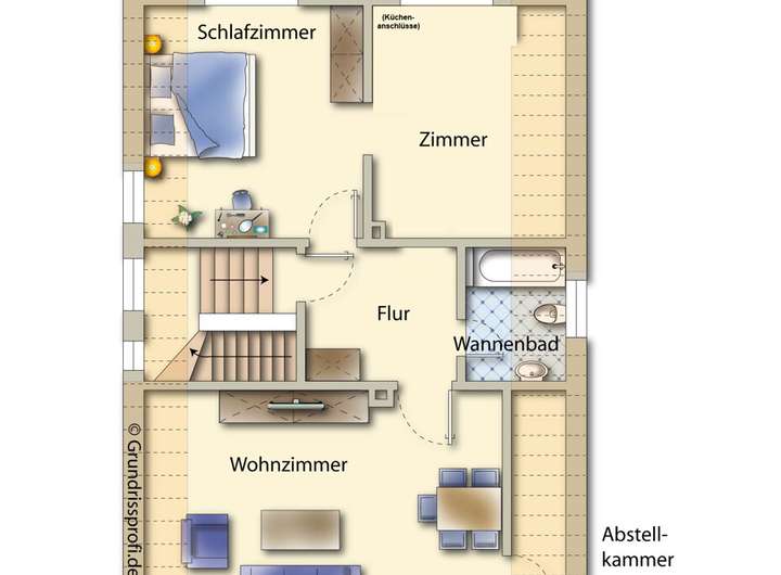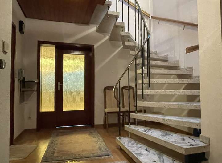Im Erdgeschoss befinden sich drei Zimmer, die Küche und das erste Bad. Im Obergeschoss wurden zwei Räume zu einem großen Wohnbereich mit Abstellraum zusammengefasst. Das Schlafzimmer mit Balkon bietet hier einen großzügigen Ankleidebereich, ehemals ein eigenes Zimmer mit Küchenanschlüssen. Den gedämmten und beheizten Dachboden erreichen Sie über eine Wendeltreppe.