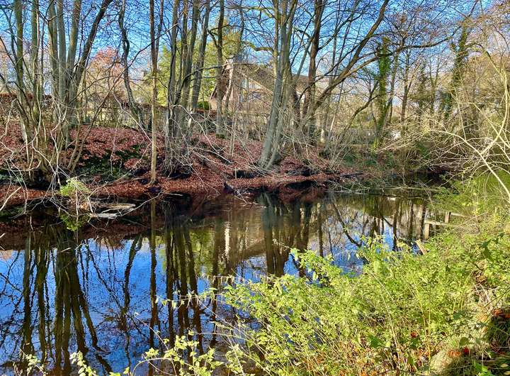 Das Grundstück liegt zurück von der ruhigen Straße und verfügt über eine Größe von etwa 3.227 m². Idyllische Uferlage, an zwei Seiten vom Alsterlauf eingerahmt, 30 km/h Gebiet.