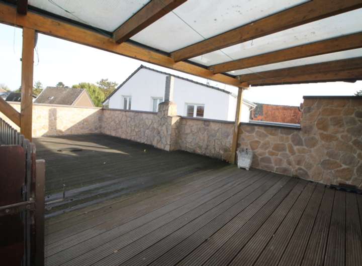 Im Obergeschoss befinden sich zwei weitere Zimmer sowie ein Badezimmer. Eines der Zimmer bietet direkten Zugang zu einer großzügigen, teils überdachten Terrasse mit einer Fläche von ca. 30 m² – ideal zum Entspannen oder für gesellige Stunden im Freien.