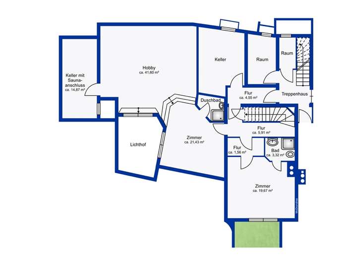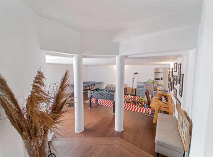 Das Untergeschoss, komplett mit hochwertigem Holzparkett ausgelegt, bietet z.B. den Kindern mit zwei Duschbädern viel Platz. Der im Moment als Hobbyraum genutzte, sehr große, Bereich des Untergeschosses war ursprünglich ein innenliegendes Schwimmbad, was jederzeit wieder als solches rückgebaut werden kann. Neben einem Raum, in dem sich ein Anschluß für eine Sauna befindet, gibt es auch noch einen weiteren Kellerraum.
