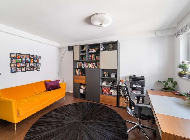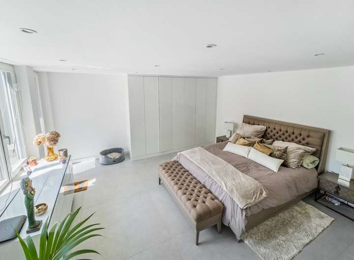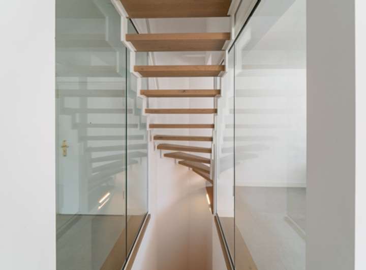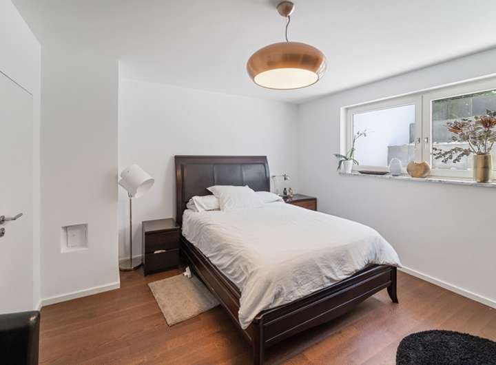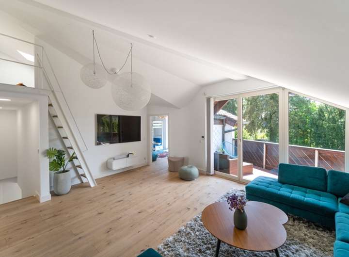 Im Obergeschoss befinden sich ein großer Wohnraum als zentraler Aufenthaltsbereich, zwei Schlafzimmer sowie ein kleinerer Raum als Ankleide oder Büro, ein Bad und zwei schöne Balkone.