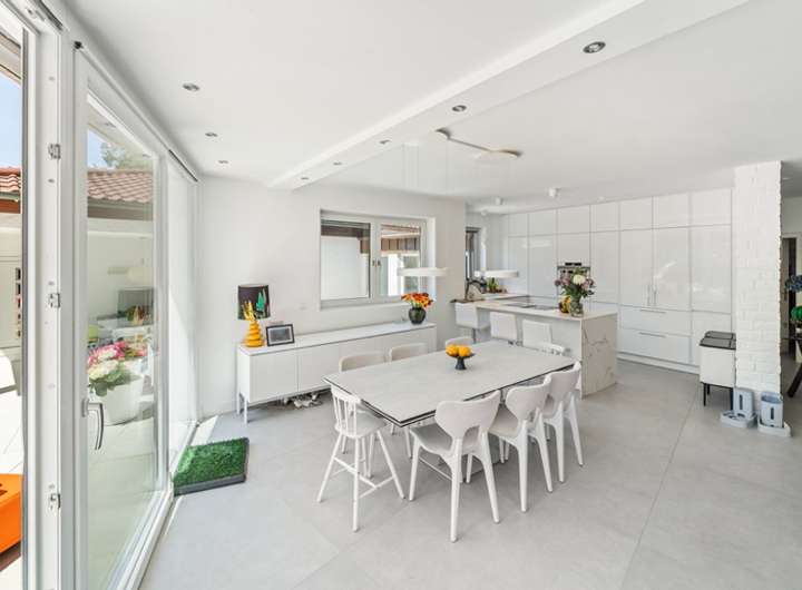 Nach dem Eingangsbereich des Hauses eröffnet sich Ihnen der großzügige Wohn-/ Essbereich mit offener Küche, der komplett zum großen Südgarten ausgerichtet ist. Egal wo sie sich in diesem Raum befinden, in der Küche, am Essplatz, oder am offenen Kamin, Sie haben immer einen Blick ins Grüne. Die durchgehend verlegten, großformatigen, hellen Feinsteinfliesen verschaffen eine behagliche Wohnatmosphäre. Des Weiteren finden Sie im Erdgeschoss noch ein großes Schlafzimmer und ein kleineres Zimmer, das z.B. als Arbeitszimmer genutzt werden kann. Ein modernes Duschbad und ein Gäste-WC runden das Raumangebot im Erdgeschoss ab.