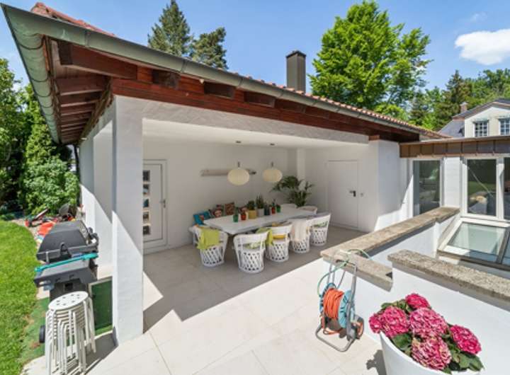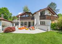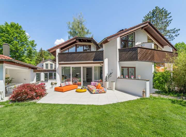 Dieses großzügige Ensemble-Haus befindet sich auf einem parkähnlichen Grundstück mit insgesamt über 1.000 qm zur Sondernutzung in Toplage von Grünwald in der Nähe der Bavaria Filmstudios am Geiselgasteig. Die Südausrichtung der Terrasse mit weitläufigem Garten lädt zum Sonnenbaden, Grillen und Relaxen ein. Im Osten grenzt direkt eine größere bewaldete Grünzone, der Grünwalder Forst, an das Ensemble. Herrliche Wanderungen oder Ausfahrten bieten sich förmlich an.