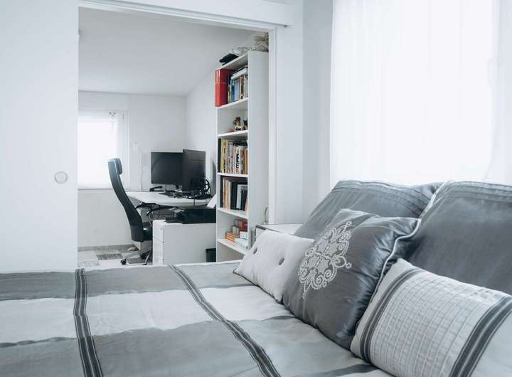 Gegenüber von der Treppe befindet sich das Gästezimmer mit direktem Zugang zur Dachterrasse, hier können Ihre Gäste oder Sie ungestört den Ausblick auf die Felder genießen.