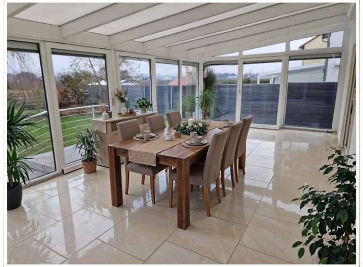 Ganzjahres-Wintergarten (errichtet 2018) mit Klima-Anlage mit eigener Wärmepumpe, Fußbodenheizung und elektrisch bedienbarer Außenbeschattungsanlage;