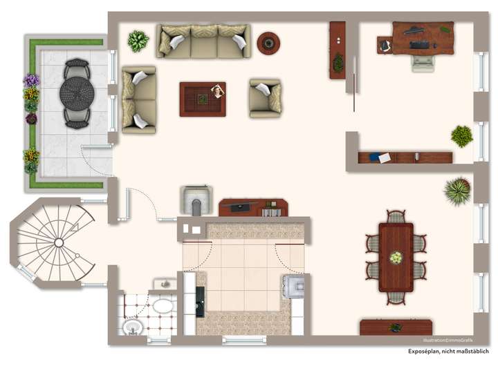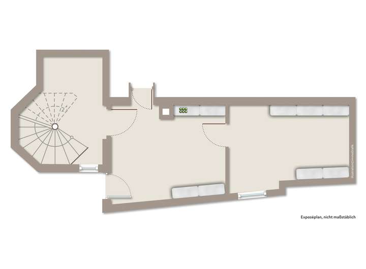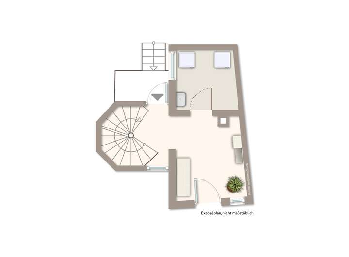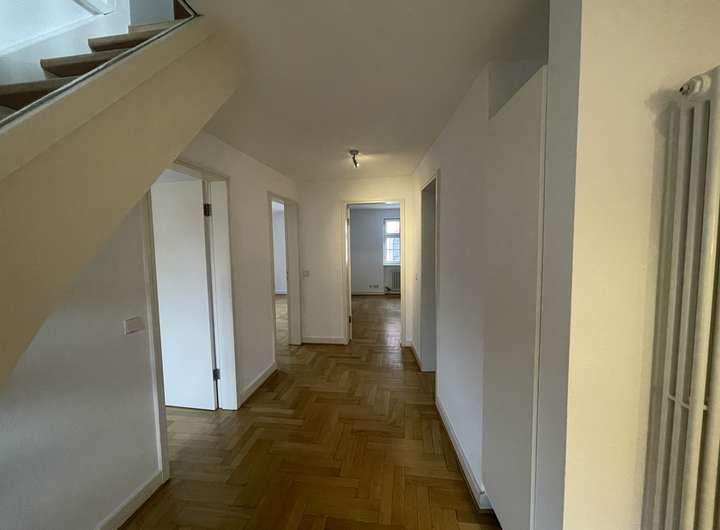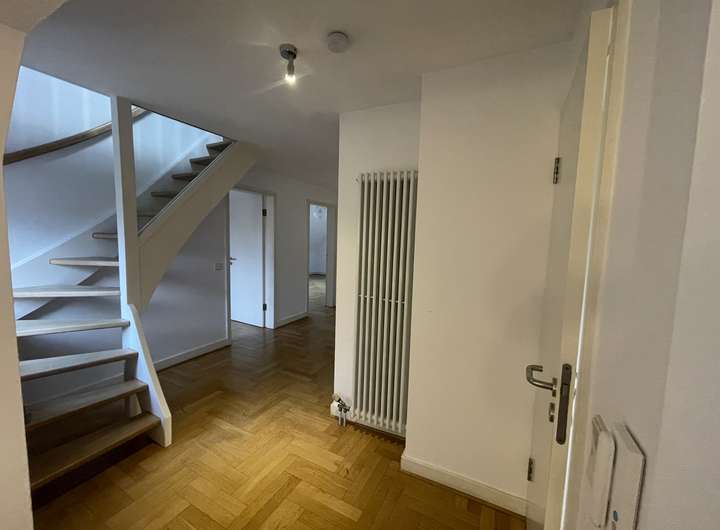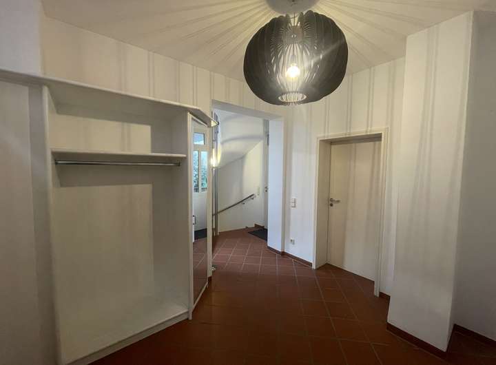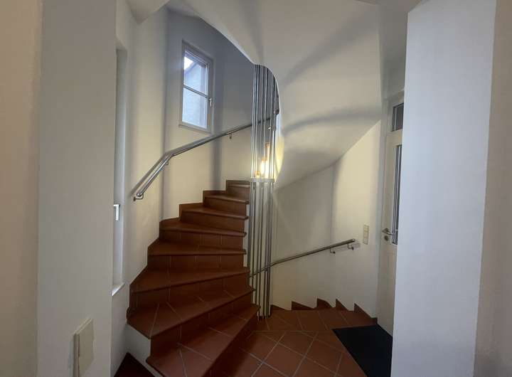 Der Zugang erfolgt über einen separaten Hauseingang. Ein angrenzender Innenhof kann etwa zum Abstellen von Fahrrädern oder als geschützter Aufenthaltsbereich genutzt werden. Im Eingangsbereich befinden sich ein Einbauschrank sowie ein großzügiger Hauswirtschaftsraum. Von hier aus führt eine massive Wendeltreppe in die obere Wohnetage.