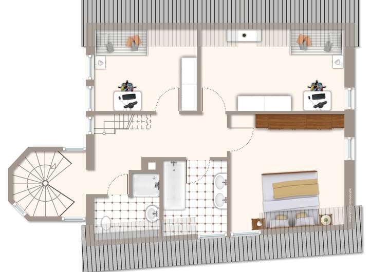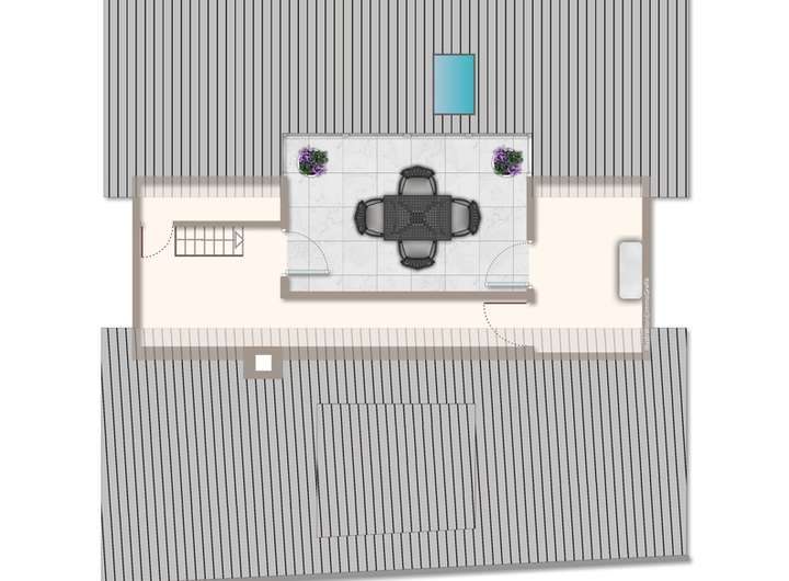 Im Dachgeschoss befindet sich der Spitzboden, der weiteren Stauraum bietet und gleichzeitig den Zugang zur Dachterrasse ermöglicht. Diese schafft einen besonderen Rückzugsort mit Blick über die Dächer von Ettlingen.