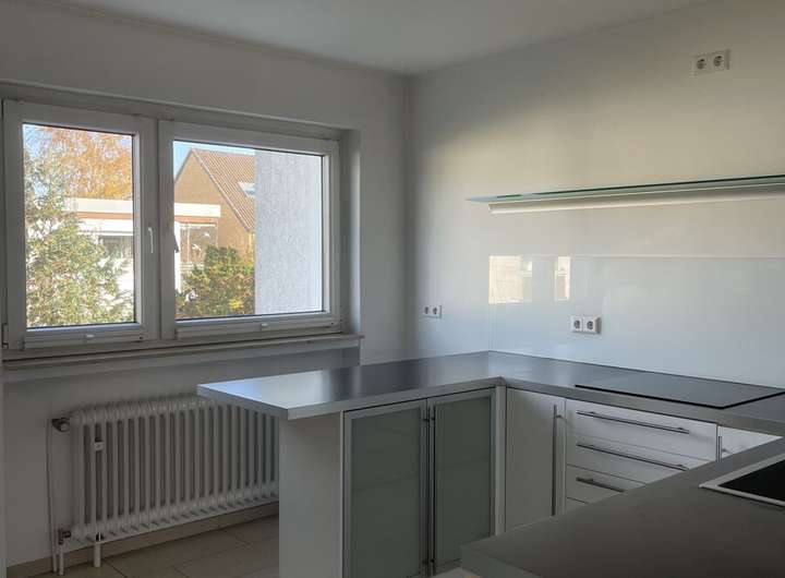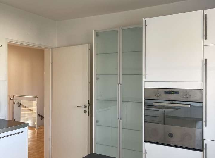 Die Wohnebene im OG umfasst außerdem eine großzügige Küche mit weißer EBK, ein neuwertiges Wannenbad sowie einen sonnigen Balkon. Parkett und großflächige Fenster unterstreichen das helle, freundliche Ambiente.