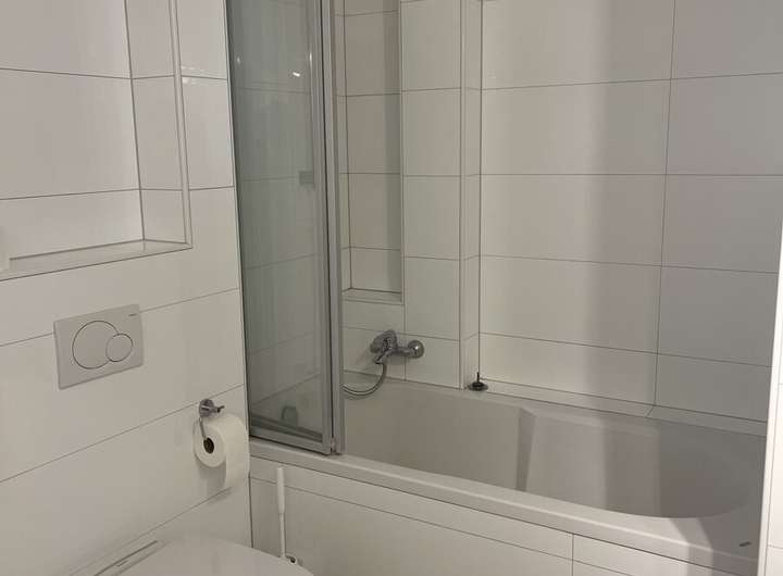 – modernes, zeitlos in Weiß gefliestes Wannenbad