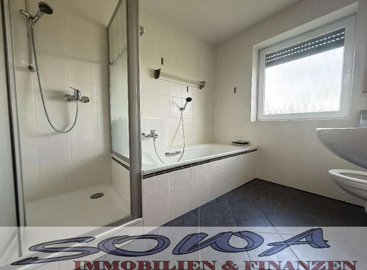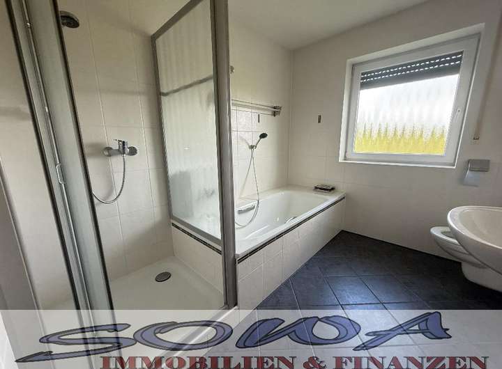 Tageslichtbadezimmer mit Dusche, WC, Waschbecken und Badewanne