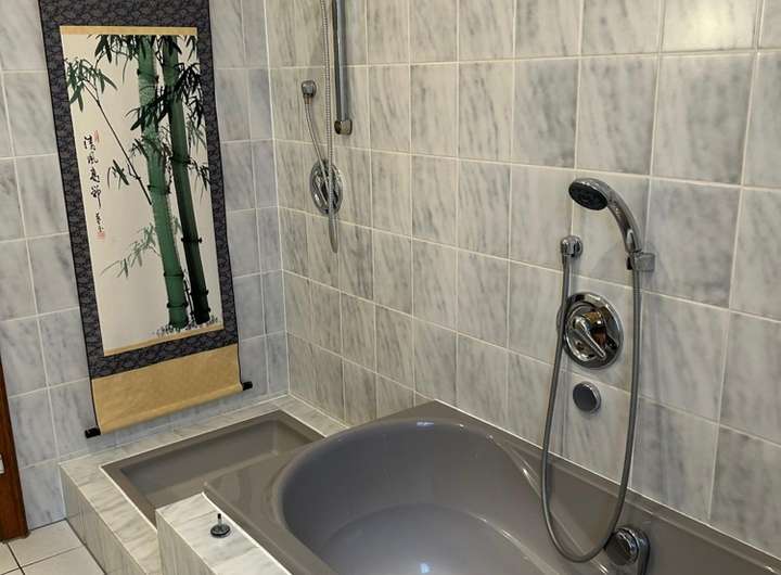 In einem separaten Trakt befinden sich ein Schlafzimmer mit Terrassenzugang, ein Ankleidezimmer, ein großes Bad mit Wanne sowie ein Gäste-WC.