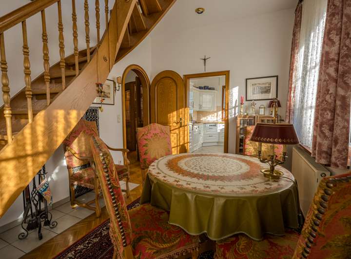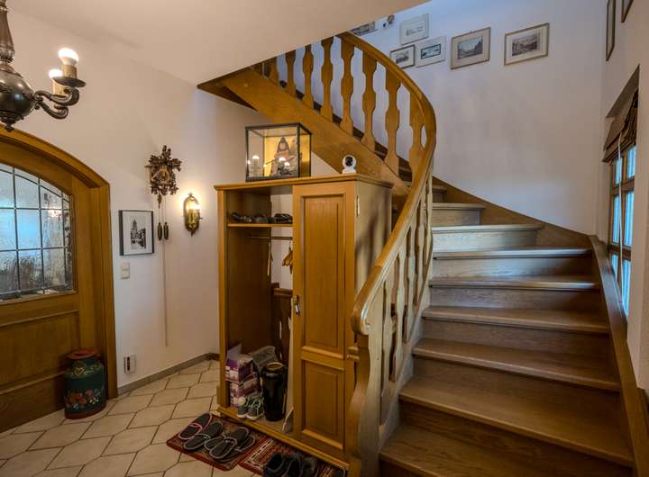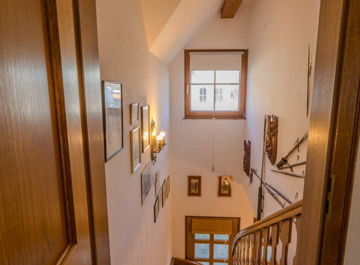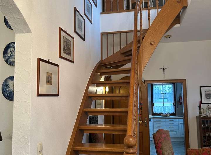Eine charmante Innentreppenführung verbindet den Wohnbereich zusätzlich mit der Galerie im Obergeschoss.