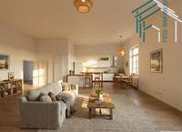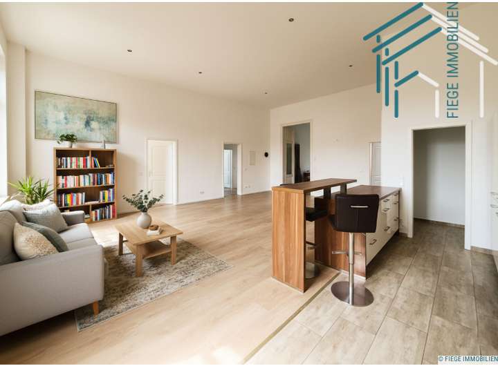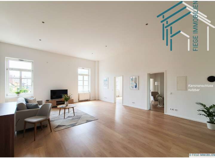 Schon beim Betreten der Wohnung durch die zweiflüglige Eingangstür eröffnet sich ein beeindruckender Wohnbereich mit rund 55 m² Fläche. Hier finden sowohl ein gemütlicher Sitzbereich als auch ein großzügiger Esstisch problemlos Platz. Ein Kaminanschluss sorgt für zusätzliche Wohnqualität und macht den Raum zu einem idealen Mittelpunkt des Alltags. Die große Fensterfront lässt viel Licht einfallen und schafft eine freundliche, offene Atmosphäre.