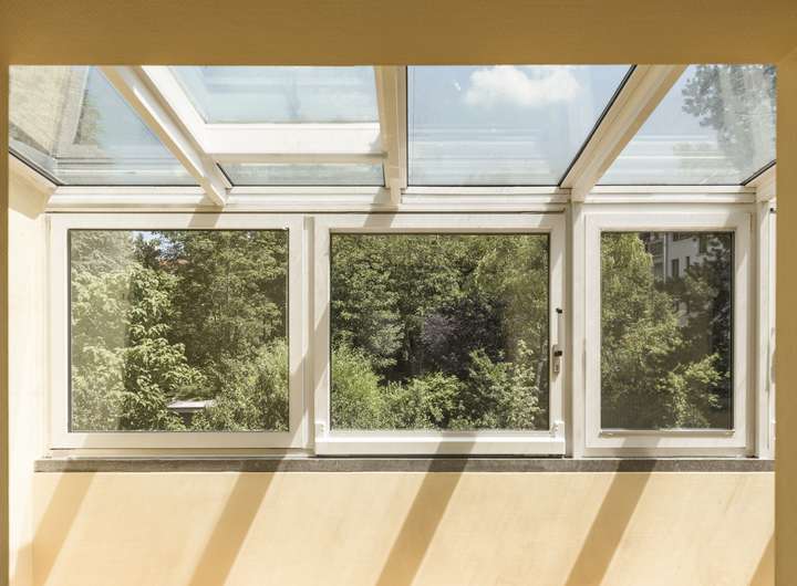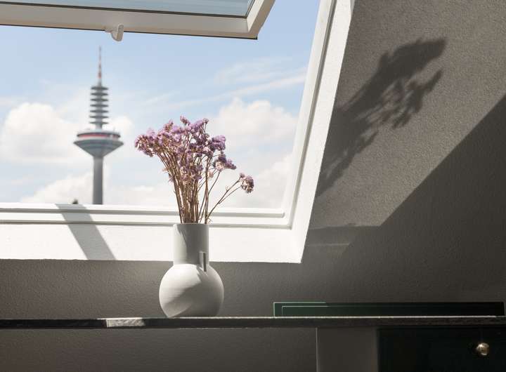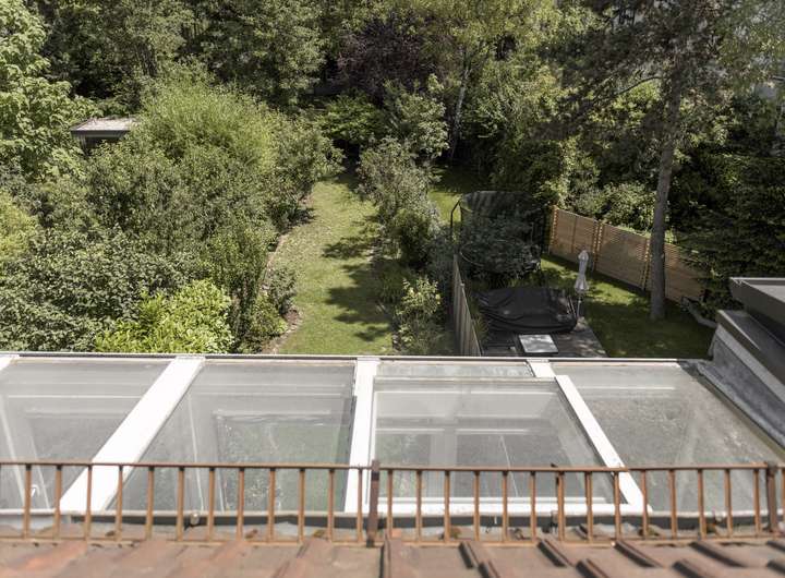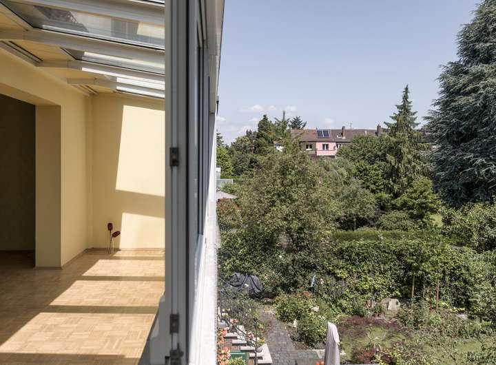 Von den einzelnen Wohnetagen hat man einen wunderschönen, unverbauten Blick ins Grüne auf die schön angelegten Gärten und die historischen, malerischen Dächer des Dichterviertels.