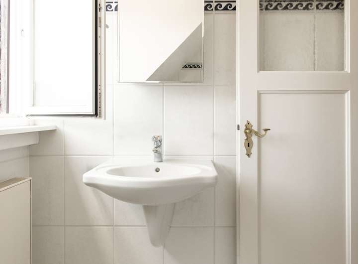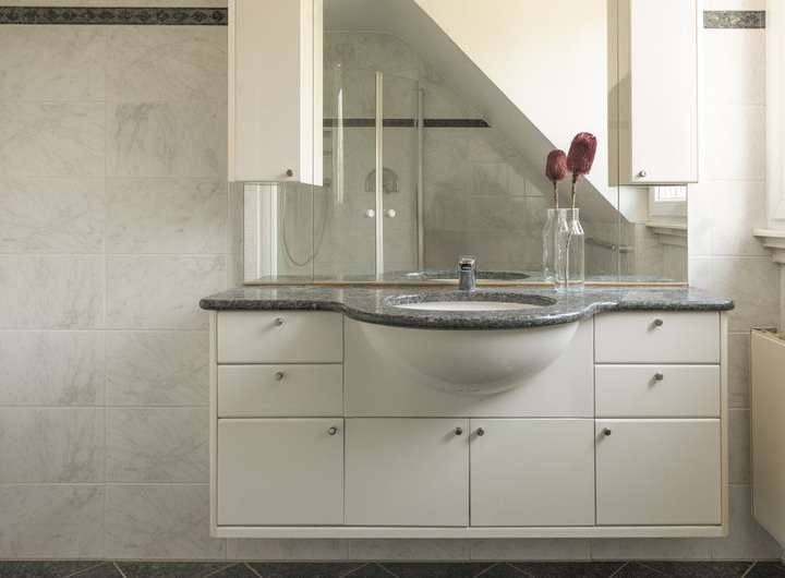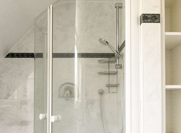 In sämtlichen Wohn- und Schlafräumen wurde Holzboden, teilweise im Würfelmuster, verlegt. Das einheitliche Material- und Farbkonzept wird in den Bädern fortgesetzt.