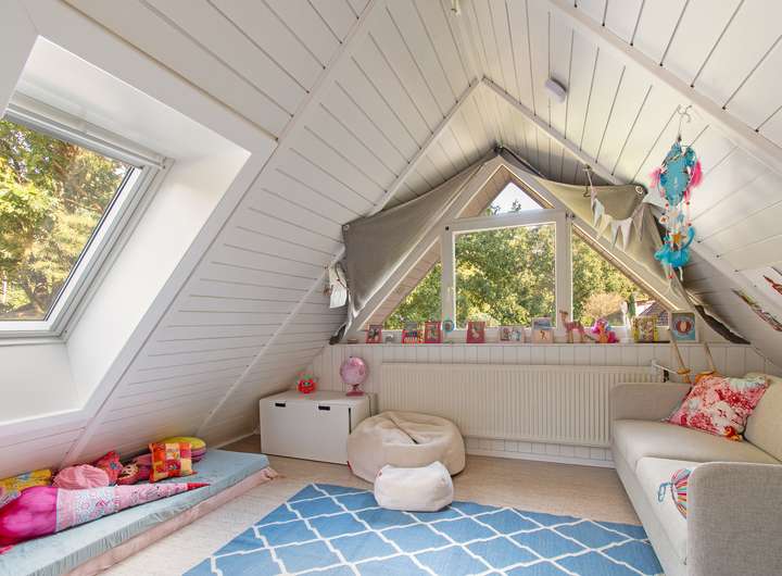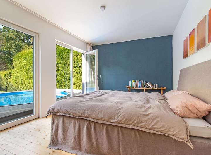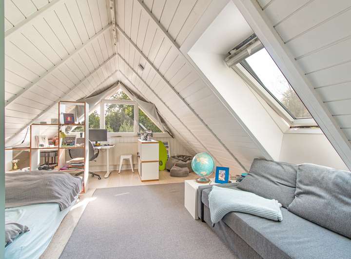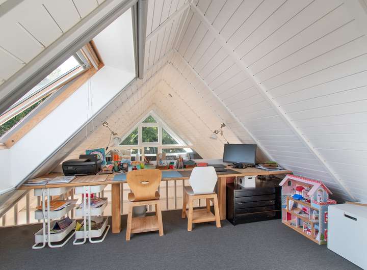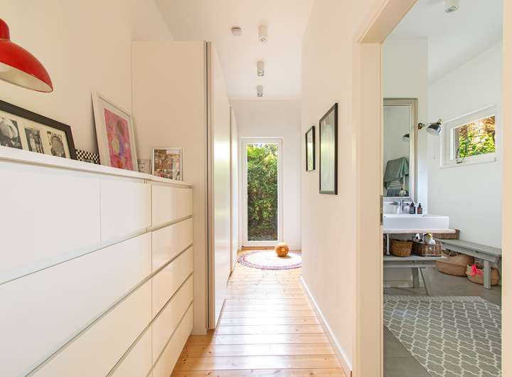 Das dänische Holzhaus wurde 1993 erbaut, 2017 um einen Anbau erweitert und modernisiert. Im Zuge dessen wurde das Dach vollständig erneuert, gedämmt und mit einer neuen Gaube ausgestattet. Dabei wurde der Dachüberstand durch Versetzen eines Fensters in den Wohnraum integriert und bietet nun eine herrliche Kuschelgalerie, die über eine Treppe aus dem Wohnbereich zu begehen ist. Der circa 45 m² große Anbau beheimatet seitdem den Elternschlaftrakt inklusive Ankleide und großzügigem Badezimmer.