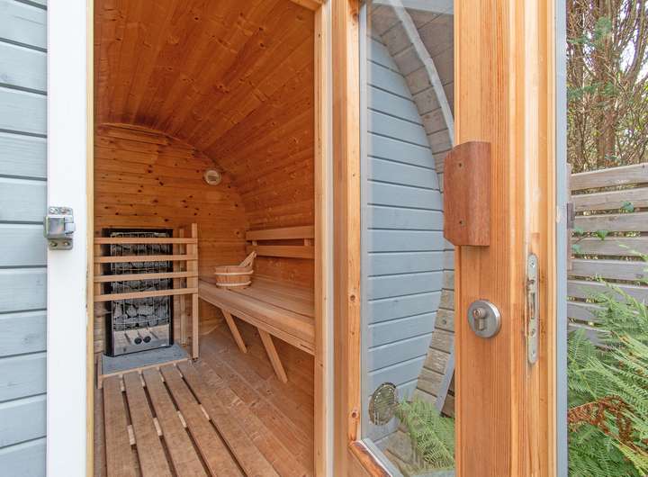 - Fass-Sauna im Garten für entspannte Stunden inmitten der Natur