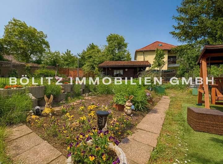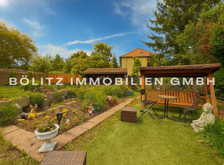 Im vorderen Bereich des Grundstücks befindet sich ein hochwertiges Holzhaus mit eigener Sauna – ein idealer Rückzugsort. Im hinteren Teil des Grundstücks wartet ein weiteres Holzhaus, ein angelegtes Blumenbeet sowie eine idyllische Grillecke mit Blick ins Grüne – perfekt für gesellige Sommerabende.