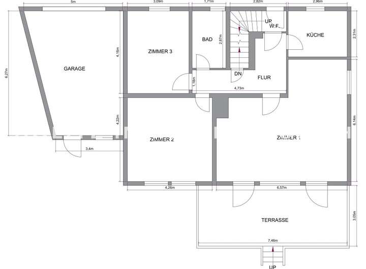 Beim Betreten des Hauses empfängt Sie ein einladender Flur, von dem Sie direkt in das helle Wohnzimmer gelangen. Hier sorgen Parkettboden, große Fensterfronten und der Zugang zur sonnigen Terrasse für eine angenehme Wohnatmosphäre. Eine Markise sowie Jalousien bieten zusätzlichen Komfort. Angrenzend befindet sich die funktional ausgestattete Küche, die sowohl kurzen Wegen als auch familiärem Zusammensein gerecht wird. Ergänzt wird das Erdgeschoss durch ein weiteres Zimmer, das sich ideal als Arbeits- oder Gästezimmer eignet. Direkt daneben befindet sich ein großes Tageslichtbad.