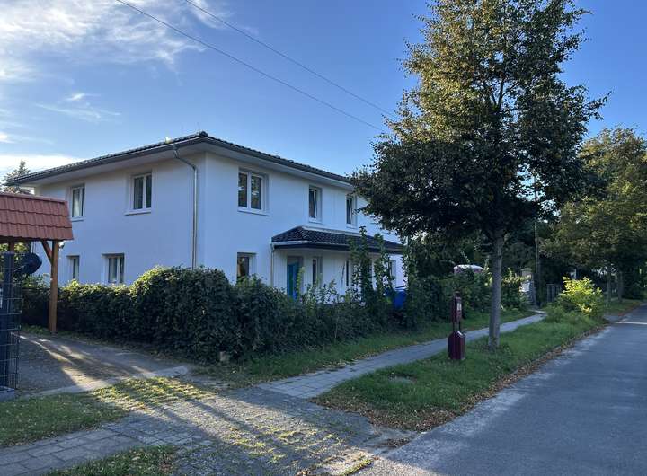 Auf einem ca. 900 qm großen Grundstück steht ein Doppelhaus in massiver Bauweise nach den modernen Anforderungen des Wärme- und Schallschutzes zur Vermietung. Jede Doppelhaushälfte weist eine Wohnfläche von ca. 138 qm auf. Die Raumaufteilung ist klassisch und gut geeignet für eine Familie. Das großzügige Wohnzimmer mit offener Wohnküche mit 38 qm ist dank zweier großer doppelflügeliger Terrassentüren, eines weiteren bodentiefen Fensters sowie eines Küchenfensters lichtdurchflutet. Wohnzimmer und Terrasse haben perfekte Südwest-Ausrichtung mit Blick auf den Garten. Neben Wohnzimmer und Küche sind vom Flur aus das Gästebad mit Dusche und der Hauswirtschaftsraum zu erreichen. Eine offene Holztreppe führt ins Obergeschoss mit drei gut geschnittenen Zimmern (17 qm, 16 qm, 13 qm) und dem Familienbad mit ebenerdiger Dusche und einer Badewanne.
