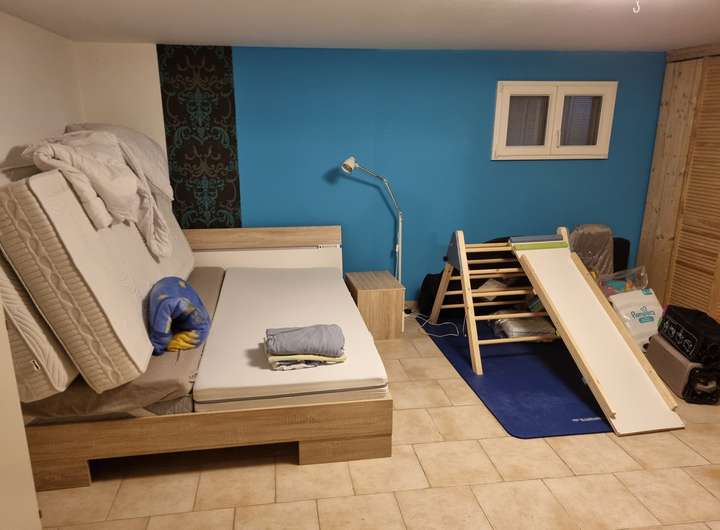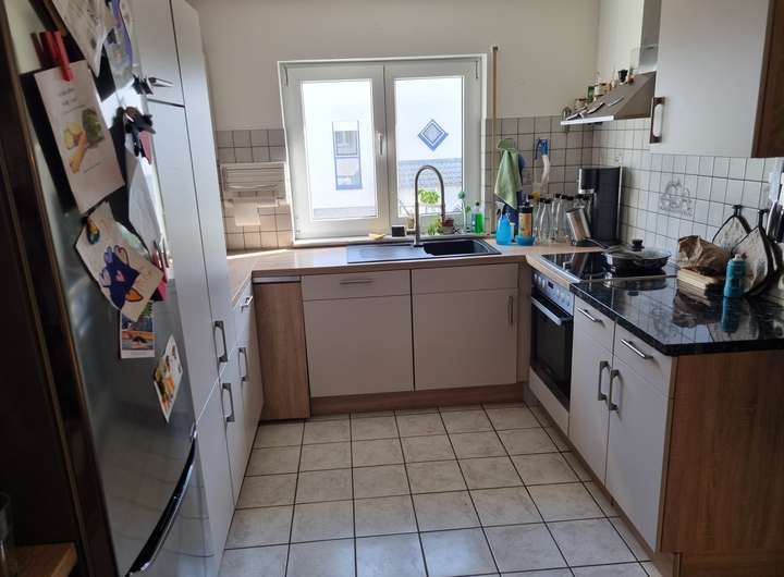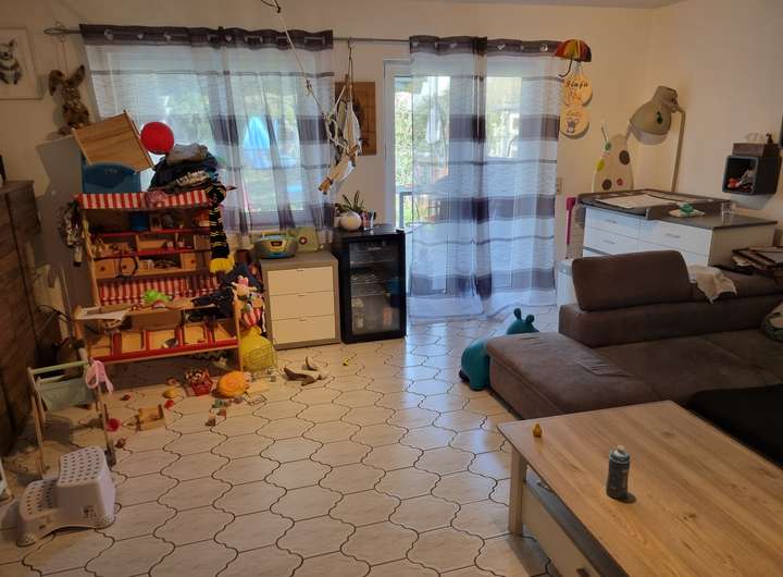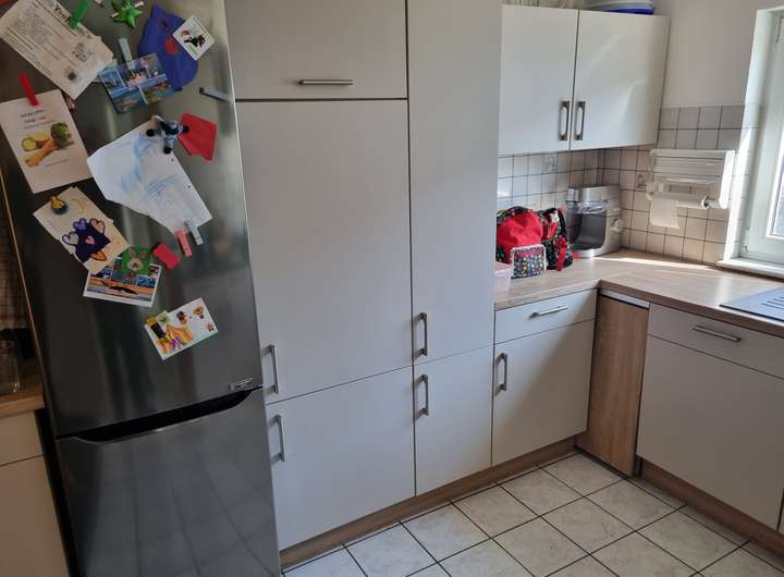 Das helle großräumige Reihenmittelhaus liegt in ruhiger und bevorzugter Wohnlage von Karlsruhe-Oberreut. Im Erdgeschoss befindet sich neben dem Gäste WC und Dusche ein großes Zimmer (26m²) mit Zugang zur Gartenterrasse sowie eine Garage mit elektrischer Fernbedienung. Über das offene Treppenhaus gelangen Sie in das lichtdurchflutete Wohnzimmer (26m²) sowie die Küche und den Essbereich (zusammen nochmals 12,5 m²). Ebenfalls im 1. OG ist ein zusätzliches WC. Im 2. OG (ohne Dachschrägen!) befindet sich ein großes Schlafzimmer (26m²) sowie ein Kinderzimmer (12,5m²) und das Bad.
