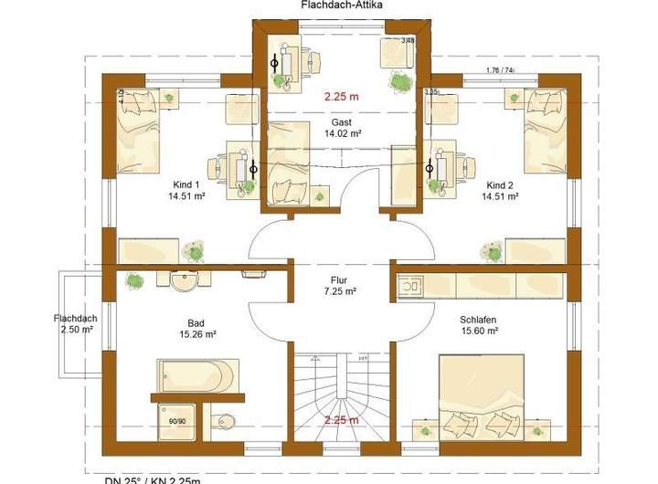 Dieses Einfamilienhaus Clou 158 mit einem 2,25 m hohen Kniestock bietet viel Platz und fast keine Dachschrägen in der oberen Etage. Die Variante mit "drittem Giebel in Flachdachoptik" erweitert auf sinnvolle Weise den Essbereich im Erdgeschoss und vergrößert gleichermaßen das Gästezimmer im Dachgeschoss um weitere vier Quadratmeter. Somit können im Dachgeschoss sogar drei, nahezu gleich große, Kinderzimmer untergebracht werden. Ebenfalls in der oberen Etage befindet sich das Elternschlafzimmer und das moderne Familienbad mit modernem Zuschnitt.