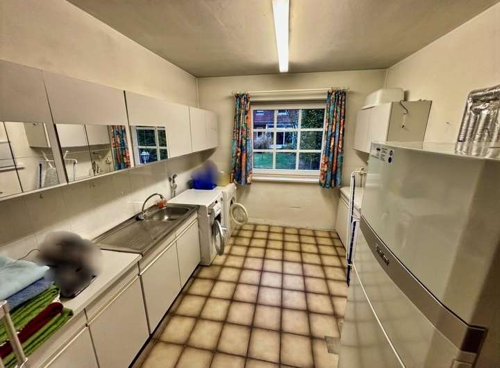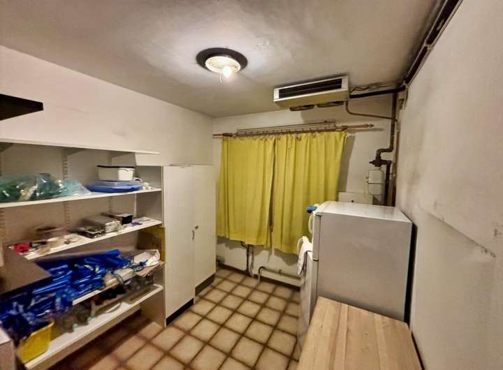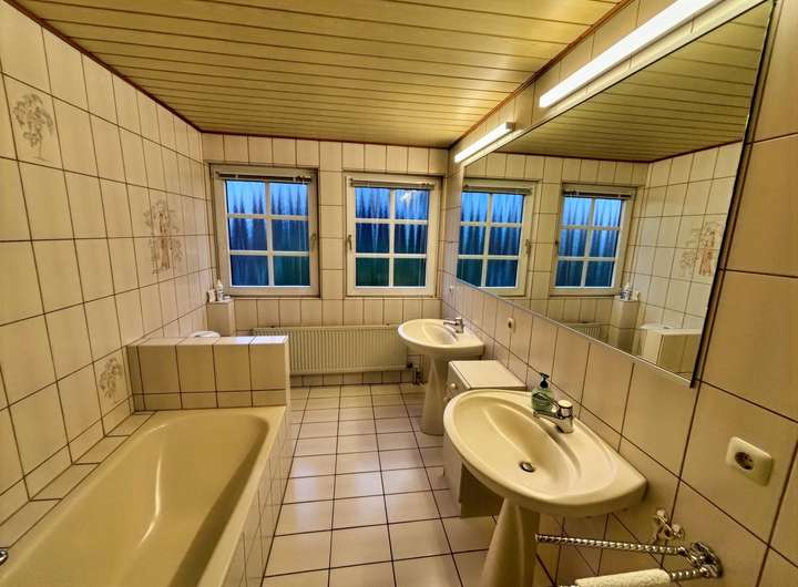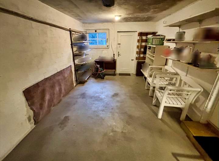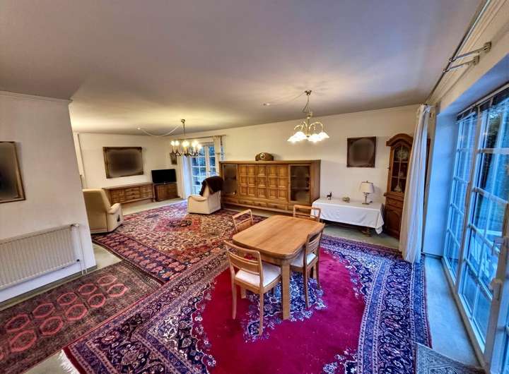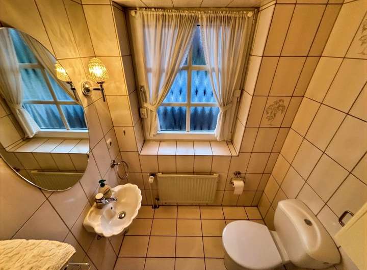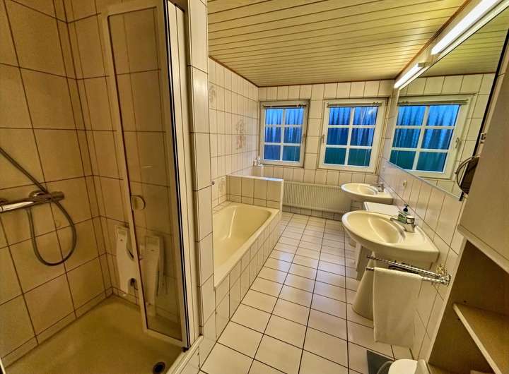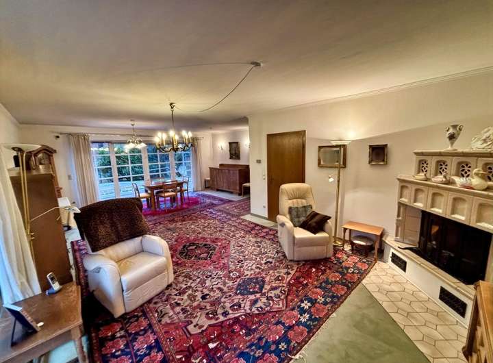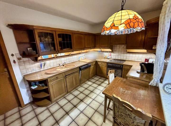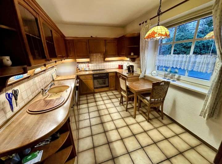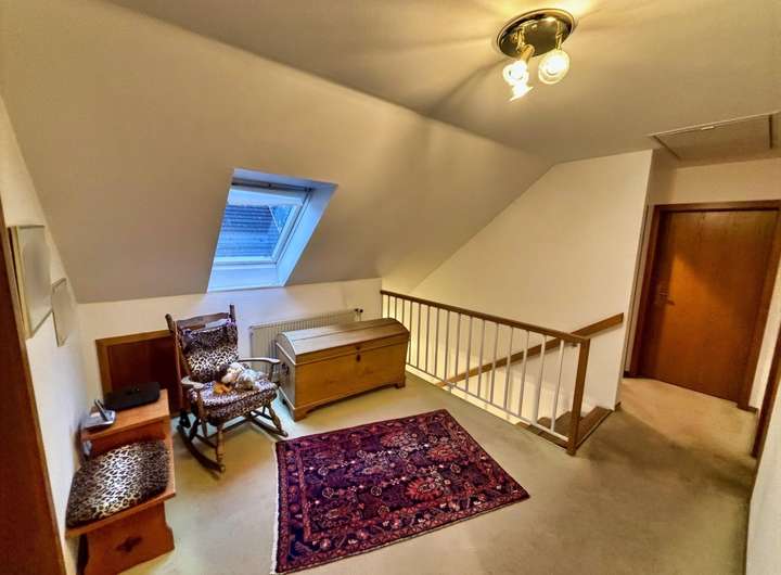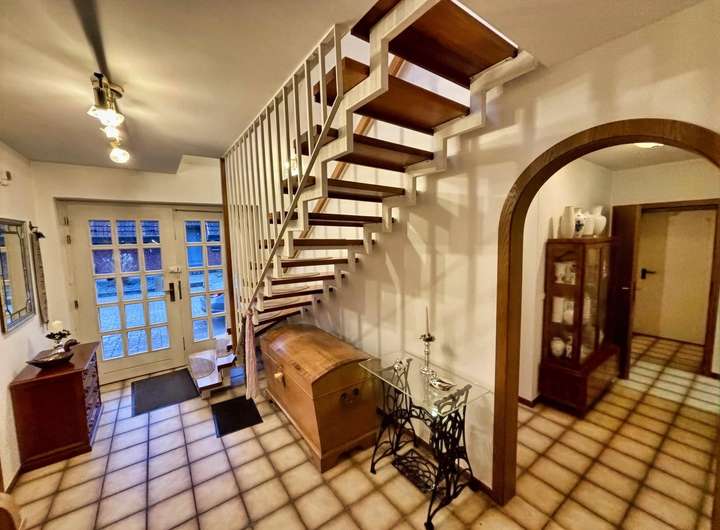 Der einladende Wohn- und Essbereich bildet das Herzstück des Hauses. Großzügige Fensterfronten sorgen für viel Tageslicht, ermöglichen direkten Zugang zur Terrasse und schaffen eine freundliche Wohnatmosphäre. Der Kamin lädt an kühlen Tagen zu gemütlichen Stunden ein und verleiht dem Raum zusätzlichen Charme. Die angrenzende Küche bietet ausreichend Platz für kulinarische Entfaltungsmöglichkeiten. Ein Gäste-WC, ein großer Hauswirtschaftsraum mit Dusche und ein weiterer Abstellraum mit zusätzlicher Kühlfunktion im Erdgeschoss ergänzten die funktionale Aufteilung. Der Clou: Aus der Garage haben Sie einen direkten Zugang zum Haus.